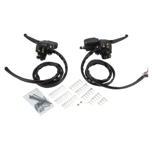 Bagger-Werx Complete Handlebar Control Kit with Backlit Amber LED Switches Dual Disc Black . These hand controls will add the finishing touch to your Harley-Davidson or custom applicationEasy to see your handlebar control switches at night with these patented amber LED backlit switchesFeatures the new 08-up style handlebar control levers and master cylinder designChrome-plated or black satin powder-coated aluminum diecast switch housings, clutch perch, bore master cylinder, lever blades and black switches with patented amber LED back lighting on the wording and symbols60" long OEM color-coded wire harness to install on to the tallest handlebars in the marketplaceThrottle side complete with throttle clampComes with the clutch starting switch installed for 07-up models. For 96-06 models it is optional to wire it inAll of the switches are pre-installed into the switch housing to save you timeIncludes all hardware, pin connectors and shrink tubingU.S.A. Patent Pending #12/783,852 & Taiwan Patent #M383519 on the switches